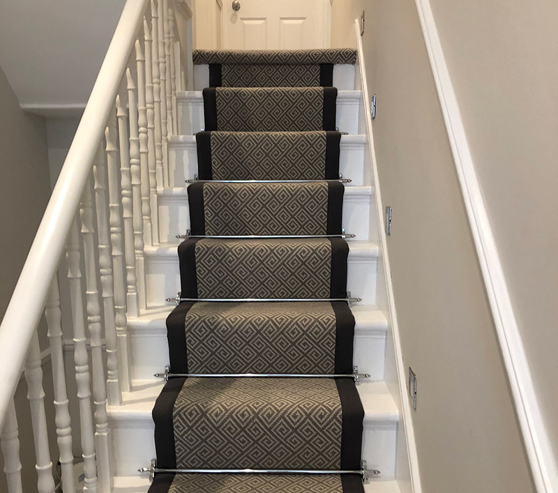 Brief: To supply & install brown patterned carpet as a runner with a black border to stairs